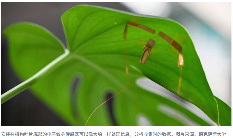 安装在植物叶片底部的电子纹身传感器可以像大脑一样处理信息,分析收集时的数据。图片来源:德克萨斯大学奥斯汀分校