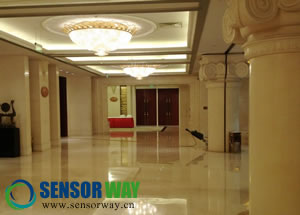 在酒店大堂内安装红外线探测器,可以自动的探测到每个区域是否有人,及时调整灯光,最大程度的做到节能减耗。