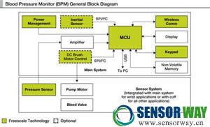 血压计的基本功能是测量动脉壁的压力。其中一个获得该测量数据的方法是使用一个可测量当前压力的压力传感器。血压的不断变化改变了控制空气泵的电机的速率。气囊压向胳膊,使其产生收缩压。当达到收缩压时,围绕在胳膊上的气门会渐渐释放空气。同时,压力传感器会进行测量。