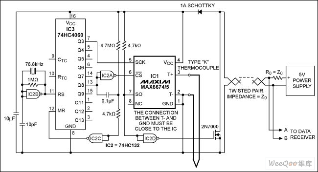 图1. 在3000英尺电缆的远端提供电源,MAX6*/MAX6675在靠近检测点的位置量化热电偶输出,使EMI降至最小。