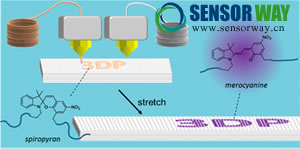 该3D打印机的一个打印头含有聚己内酯,类似于我们常见的柔性3D打印线材。而另一个打印头里含有的塑料有99.5%的组成与前者相同,但研究团队在其中插入了一种分子——螺吡喃(螺吡喃),当它被拉伸时会改变颜色。