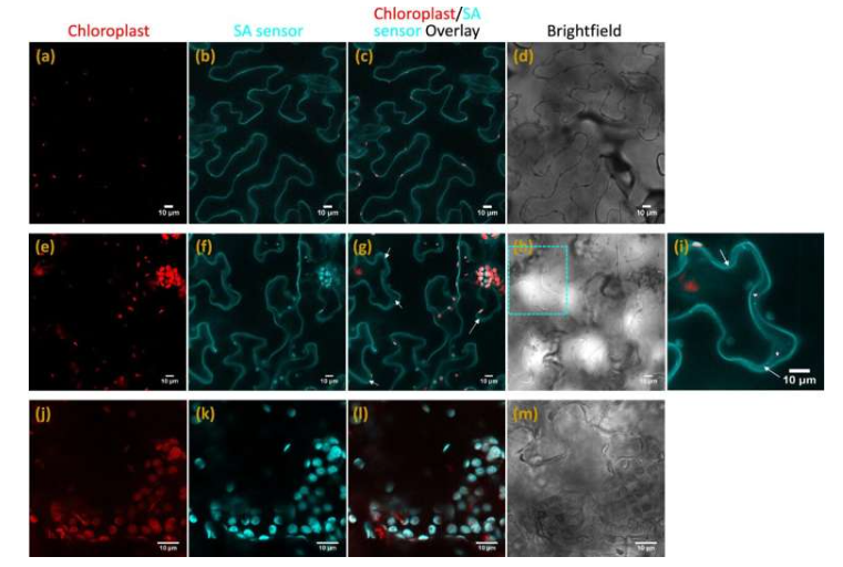 活体植物中SA纳米传感器的亚细胞定位。用SA传感器浸透的烟草叶共焦图像,以可视化SA传感器的亚细胞定位:a、e、j 叶绿素自发荧光(红色)、b、f、kSA传感器 青色荧光、c、g、l覆盖和(d, h, m)明场。第1行——SA在表皮细胞外周观察到荧光,表明细胞质定位。第2行——质溶化表皮细胞,显示由缩小的原生质体形成的胞膜空间中SA传感器荧光,如箭头所示。i 放大叠加图像,来自 g 的单元格。图片来源:自然传播(2024年)。DOI:10.1038/s41467-024-47082-1