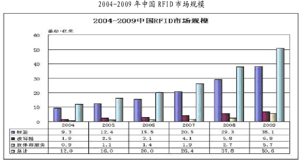易观国际预测,2009年中国RFID市场规模将达到50亿元,年复合增长率为33%,其中电子标签超过38亿元、读写器接近7亿元、软件和服务达到5亿元的市场格局。